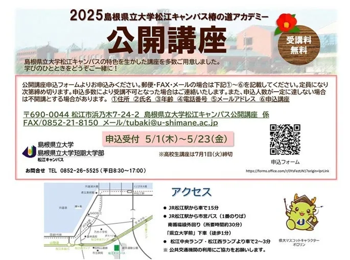 公開講座の申し込みは、ウェブサイトを通じて行うことができます。詳細情報は、島根県立大学松江キャンパスの公式サイトで確認できます。講座内容や受講日、申し込み方法などが記載されていますので、興味のある方はぜひチェックしてみてください。