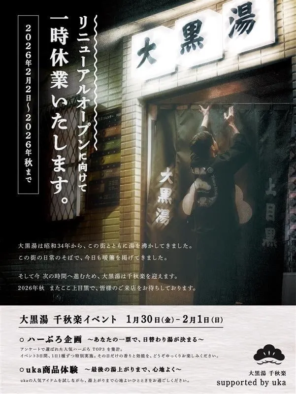 2月1日までの期間、東京・上目黒の大黒湯で特別なイベントが開催される。トータルビューティカンパニーのukaがコラボレーションし、日替わりの”ハーぶろ”を楽しめる最後の機会となっている。このイベントは、2025年10月15日から始まった”ハーぶろ”の集大成とも言えるものだ。この期間中、伊豆や石垣産のハーブを使用した湯に入ることができ、3日間の千秋楽イベントでは、特に人気の薬湯としてクロモジ、ヒノキ、月桃が日替わりで提供される。