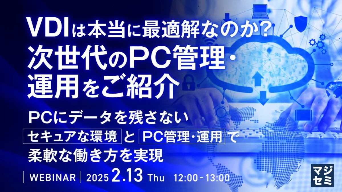 企業の情報セキュリティが年々重要な課題となる中、次世代のPC管理と運用を模索する企業様向けに、ウェビナー『VDIは本当に最適解なのか⁉次世代のPC管理・運用をご紹介』を開催します。本セミナーでは、PCのローカルデータ保存を回避し、情報漏洩リスクを軽減する新たな取り組みについて紹介します。