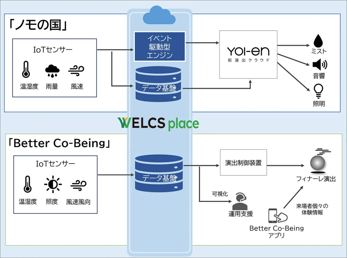 このパビリオンでは、パナソニックの「YOI-en」とWELCS placeが連携し、パビリオンの温湿度、雨量、風速などをリアルタイムにセンシングして自動的に制御します。具体的には、環境に応じてミストを噴霧する設備が整えられており、外観の演出や暑さ対策に寄与します。「光と音とミスト」をテーマとした演出は、訪れた来場者に新たな体験を提供することを目的としています。