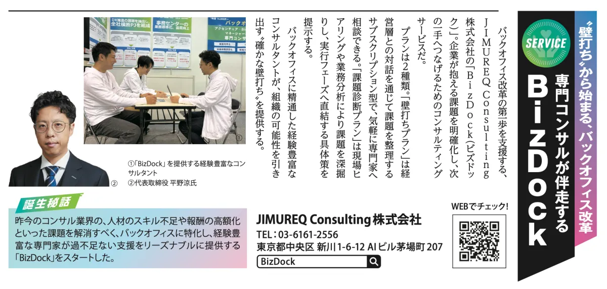 2026年2月号の『日経トレンディ』で取り上げられたJIMUREQは、企業の経営や業務において直面する課題解決を支援する専門コンサルティングファームです。そのサービス『壁打ちプラン』と『課題診断プラン』は、企業が抱える問題を整理し、次のステップを明確にするためのものです。具体的には、専門家との対話を通じて、各企業の特性や悩みを細かくお伺いし、隠れた課題を引き出します。