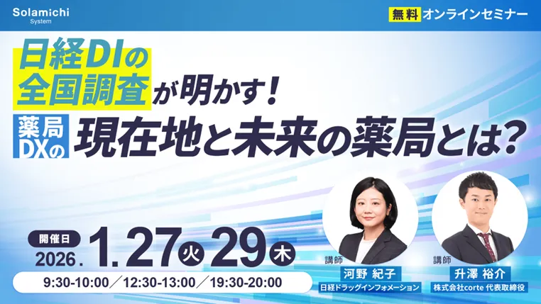 株式会社ソラミチシステムは、2024年1月の27日(火)と29日(木)に「日経DIの全国調査が明かす!薬局DXの現在地と未来の薬局とは?」というテーマで無料のオンラインセミナーを開催します。このイベントは、薬局業界におけるデジタルトランスフォーメーション(DX)の実態や、未来に求められる薬局のあり方を探る貴重な機会です。