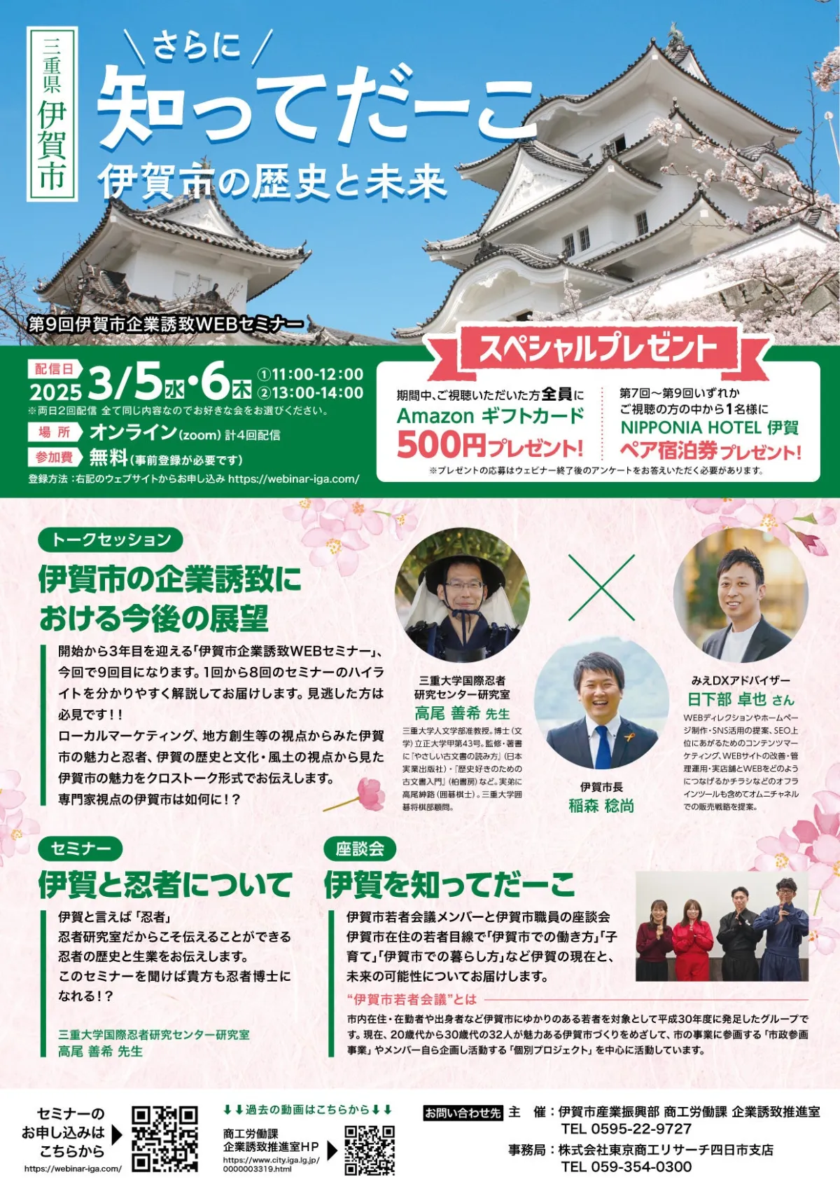 また、トークセッションでは、これまでの企業誘致WEBセミナーの振り返りを行い、みえDXアドバイザーの日下部卓也さん、高尾准教授、伊賀市長の3名によるクロストーク形式で進行します。伊賀市の文化や地方創生、企業活動における有益な情報をお届けします。