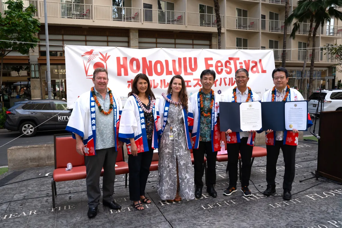 ハワイ州知事からの宣言では、3月13日から15日を「第30回ホノルル フェスティバル」とし、その歴史的な活動が称えられました。また、ホノルル市長による宣言では、同日を「ホノルル フェスティバル ウィーク」として公式に位置付けています。これらの宣言は、フェスティバルの長年にわたる貢献を祝福するものです。