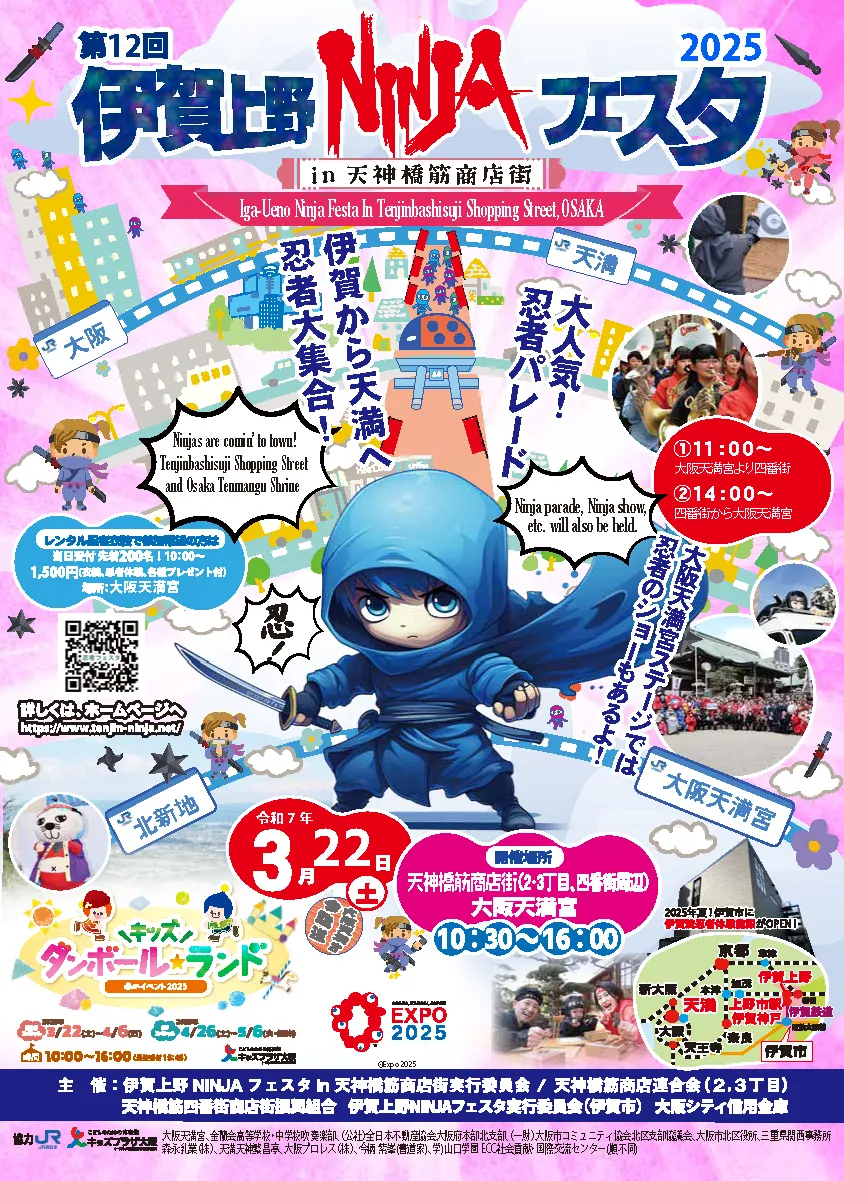 「伊賀上野NINJAフェスタin天神橋筋商店街2025」は、10:30から16:00まで開催されます。また、5月には三重県伊賀市でも同様の「伊賀上野NINJAフェスタ2025」が開催される予定です。忍者文化を堪能するこの機会をお見逃しなく!