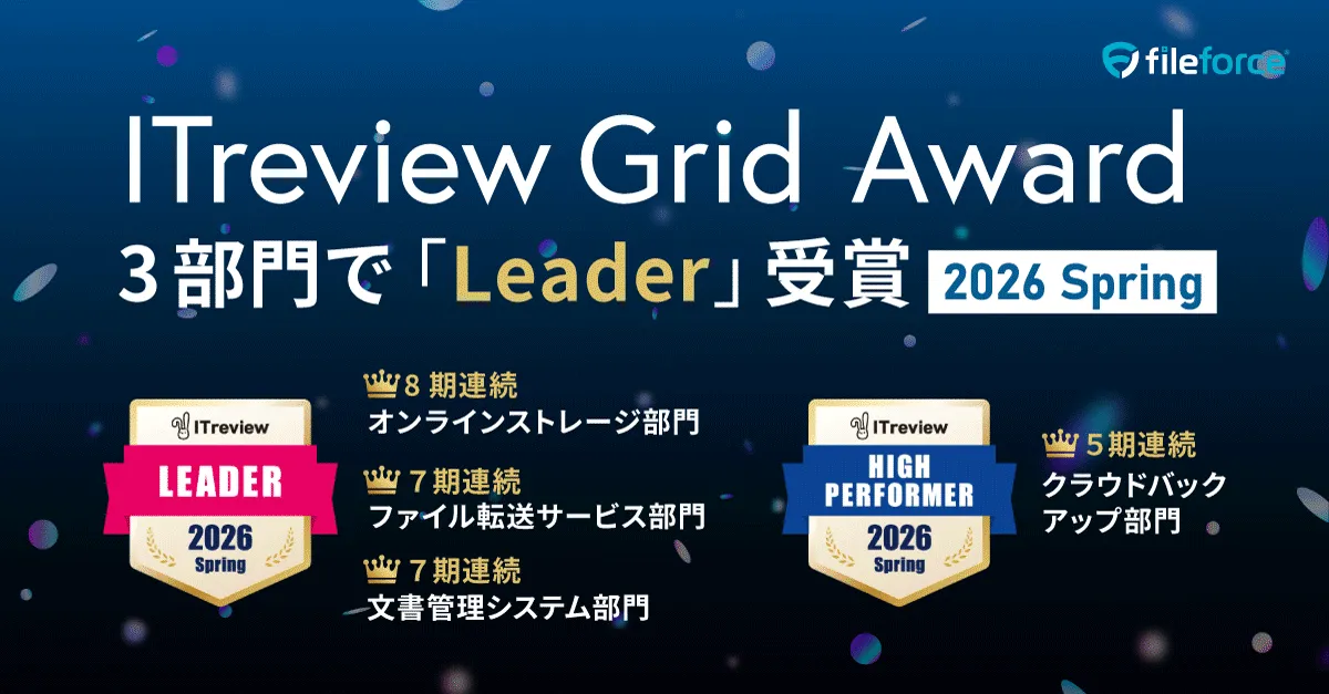 ファイルフォース株式会社は、2026年春の「ITreview Grid Award」で、オンラインストレージ、ファイル転送サービスおよび文書管理システム部門において「Leader」称号を受賞しました。この賞は、顧客の声をもとに評価されるもので、同社は8期連続でこの名誉ある称号を獲得しています。