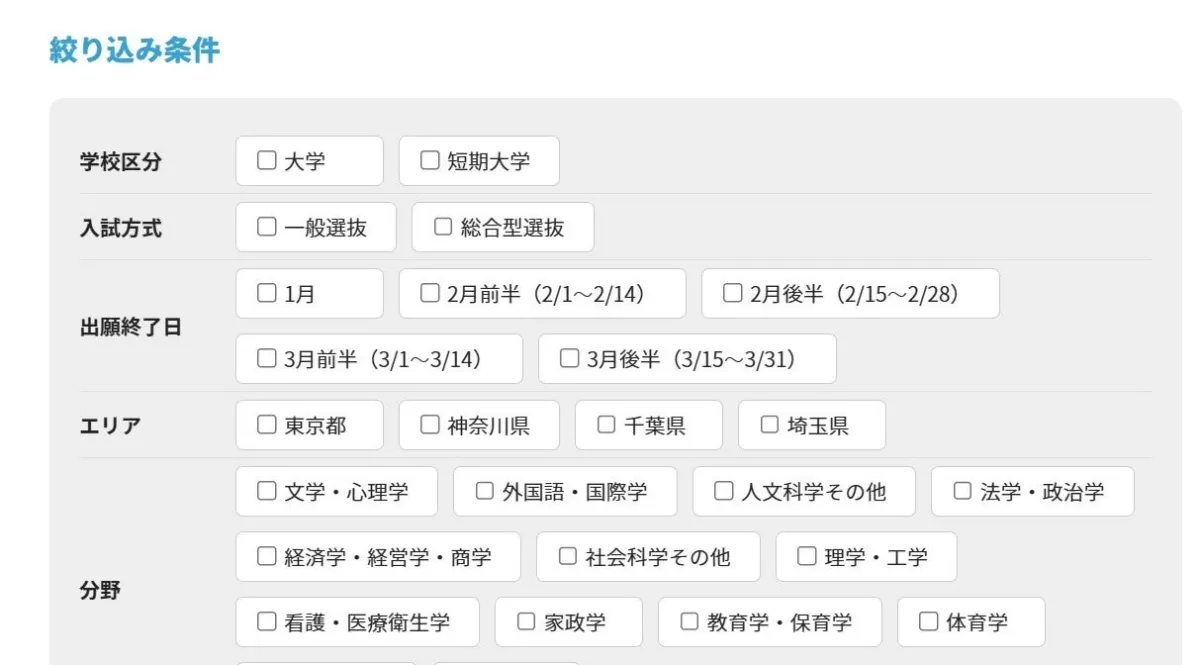 掲載されている大学数は136校にも及び、これだけの情報を網羅したWebサイトは非常に稀です。受験生は、通学エリア、志望分野、出願締切日といった条件で検索できる絞り込み機能も利用できます。
