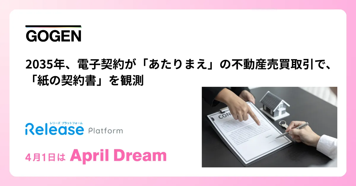 2023年4月1日、GOGEN株式会社が発表した内容は、自社の提供する「レリーズプラットフォーム」に関するものです。2035年となった現在、電子契約が不動産売買の常識となった状況で、なんと5年ぶりに「紙の契約書」の締結が観測され、業界内に衝撃が走っています。