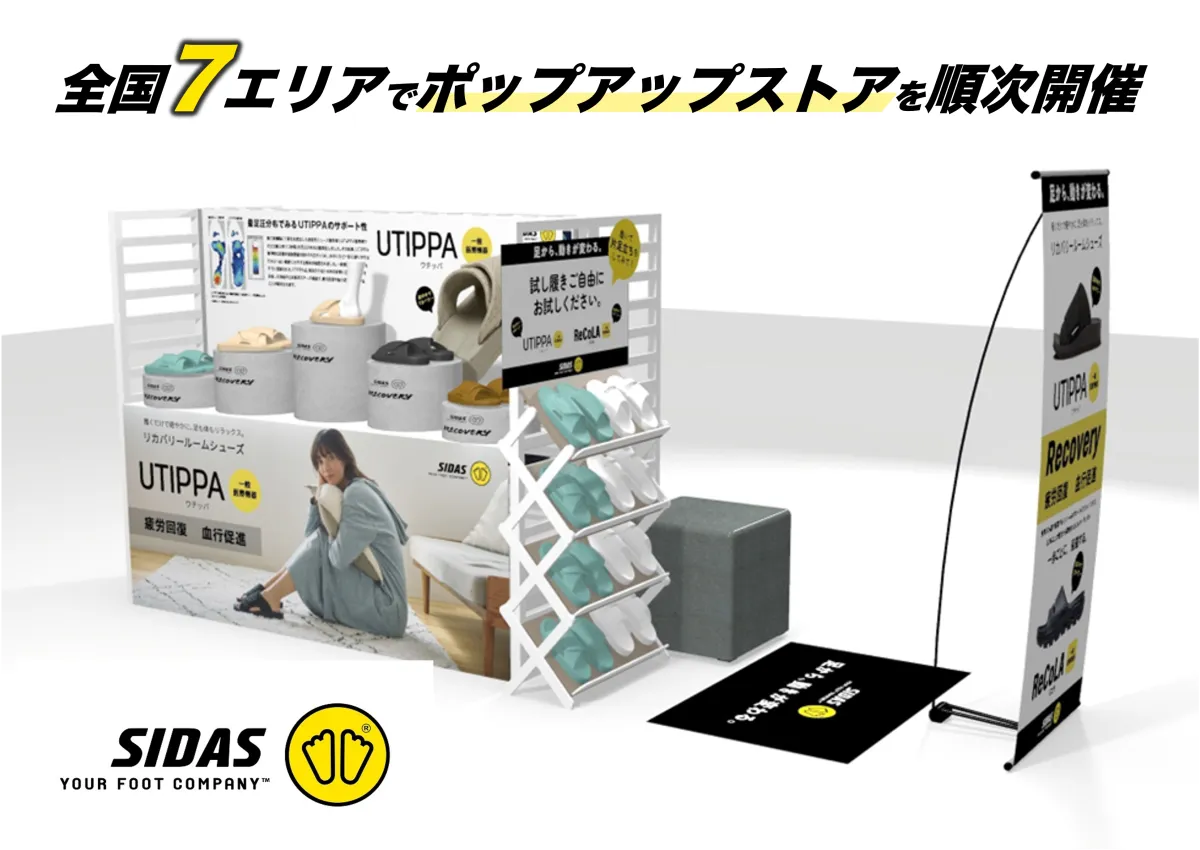 シダスジャパン株式会社が、2026年4月18日から5月31日までの間、全国7エリアでポップアップストアを順次開設します。このイベントは、同社のリカバリーサンダル「ReCoLA(リコラ)」やリカバリールームシューズ「UTIPPA(ウチッパ)」の最新モデルを実際に体験できる機会です。これは、これまでにない体験型売場を提供し、足元からのコンディショニング改善を提案するための取り組みです。