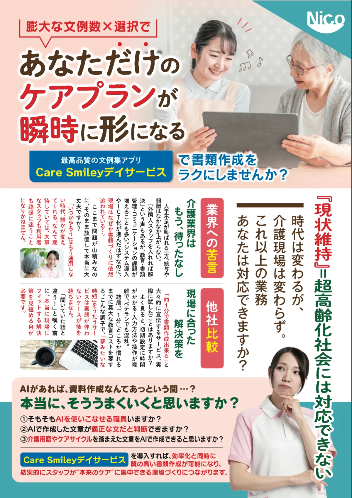 『ケアスマイリー』は、介護職員の業務負担を軽減し、質の高いサービスを提供するための強力なツールです。実務者の視点から作られた高品質な文例を活用することで、安心して利用でき、さらには業務効率化を促進。介護業界における理想的な働き方を、未来に向けて推進するサービスといえるでしょう。これからの介護事業者必見のツールです。これにより、さらなる業務効率化や職場環境の改善が期待されます。ぜひ、導入を検討してみてはいかがでしょうか。