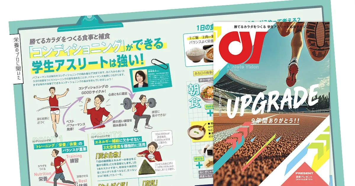 2023年4月15日より、全国の学生アスリートたちに向けて無料で配布されるフリーマガジン『アスリート・ビジョン』。創刊以来、競技力向上を目指す学生に役立つ情報を提供し続けているこの雑誌の新号の特集テーマは「UPGRADE」。アスリートたちが自身の身体をより良い状態に保つために必要なコンディショニングに焦点をあてています。