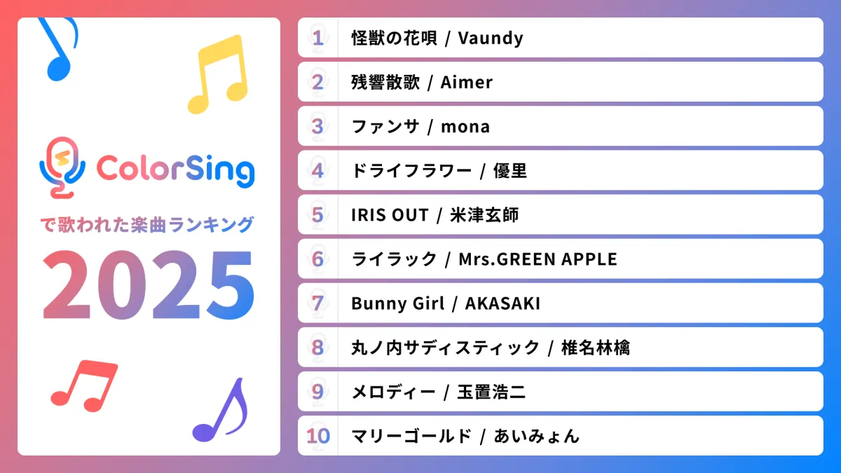 今年、「ColorSing」で多くの視聴者に歌われた楽曲は以下の通りです。1位にはVaundyの「怪獣の花唄」が輝き、続いてAimerの「残響散歌」、monaの「ファンサ」など、様々なジャンルの曲がランクインしています。