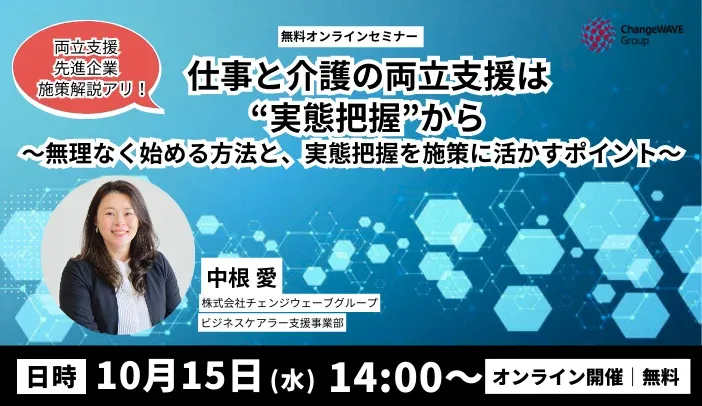 2025年10月、株式会社チェンジウェーブグループが主催する無料オンラインセミナーが開催されます。本セミナーでは、仕事と介護の両立支援に関連する実態把握の方法と、有効な施策への活用方法について討議します。