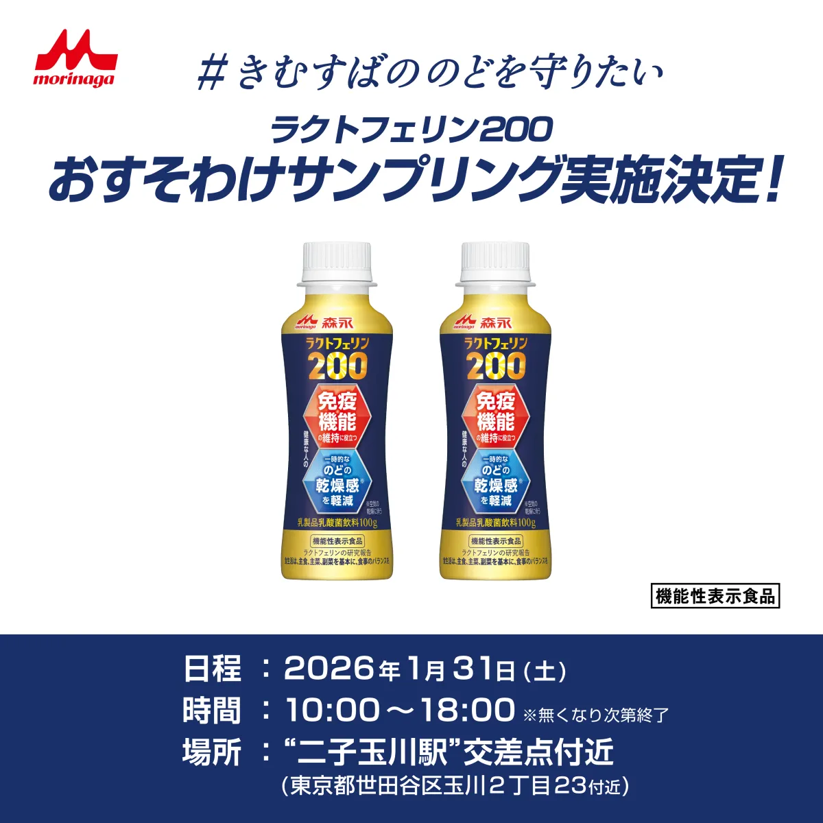 2026年1月31日、東京の二子玉川駅周辺で特別なイベントが開催される。タイトルは「木村昴さんからの『森永ラクトフェリン200ドリンクタイプ』おすそわけサンプリング」。このイベントは、木村昴さんへのファンの応援を称えるために企画されたもので、無料で「森永ラクトフェリン200ドリンクタイプ」が配布される。ファンの情熱に応え、木村さん自身が想いを形にしたこの取り組みには期待が高まる。
