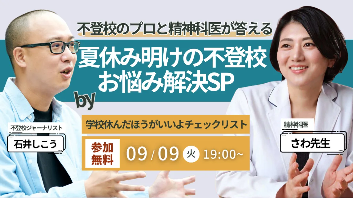 近年、学校に行きたくないと感じる子どもたちが増えています。特に夏休み明けの9月は、不登校への不安が大きくなる時期でもあります。そこで、2025年9月9日(火)に、オンラインイベント「不登校のプロと精神科医さわ先生が答える、夏休み明け不登校のお悩み解決スペシャル」が開催されます。