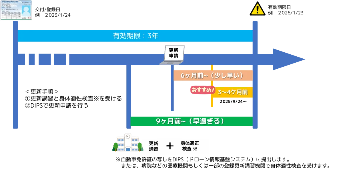 無人航空機操縦士を取得している方は、資格の交付日から3年ごとに更新手続きをしなければなりません。国土交通省航空局からのメールで案内が届いた際には、慌てて受講申込みをする必要はありません。講習は有効期限の6ヶ月前から手続きを行うことができるため、3~4ヶ月前を目安に、余裕を持って進めることをお勧めします。更新期限が1ヶ月を切ると手続きが難しくなる可能性があるため、注意が必要です。