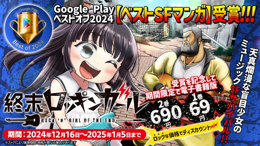 株式会社竹書房は、SFマンガの新たな傑作『終末ロッキンガール』の電子書籍版が、Google Playの「ベストオブ2024」において【ベストSFマンガ】に選ばれたことを記念して、特別セールを実施しています。著者は石山り~ち氏で、本作は「WEBコミックガンマ」で連載中です。