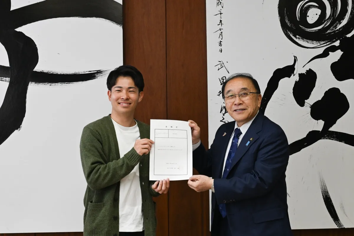 友㟢さんは、あわら市長から笑顔で委託状を受け取り、市のクリエイティブアドバイザーに就任しました。彼の卓越した技術と独自の視点を通じて、あわら市の魅力を新しい形で届ける計画が進んでいます。