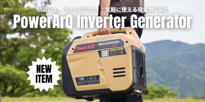 2025年7月23日、新たに予約が開始されるのは、加島商事株式会社の「PowerArQ Inverter Generator」。この新製品は、家庭用家電に対応したガソリン式インバーター発電機で、出力は3050W、最大3100Wと高出力であり、災害時やアウトドアに理想的な選択肢です。