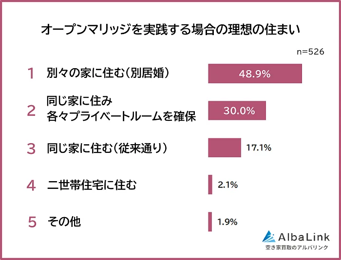 調査では、オープンマリッジを実践する場合の理想的な住まいに関する意見も集まりました。その結果、最も多くの支持を集めたのは「別々の家に住む」という選択肢です。以下に結果を整理します。