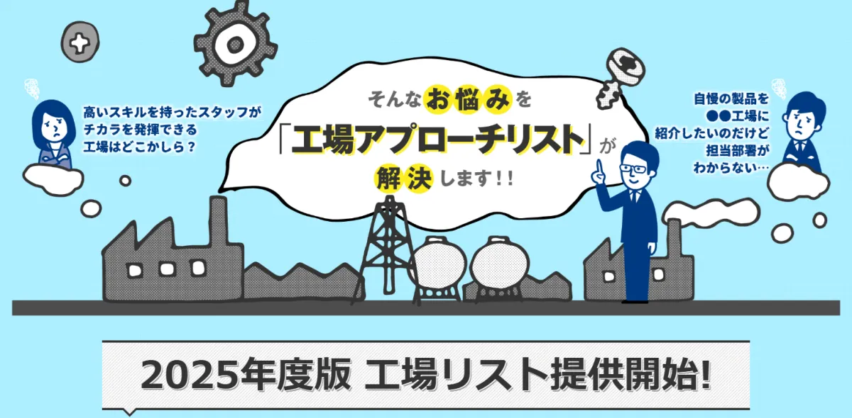 ネットビジネスサポート株式会社(NBS)が提供する「工場アプローチリスト」が、2025年度版へとリニューアルされました。このリストは、企業が保有する約10万箇所の工場情報と、各工場の内部部署データを網羅しています。最新のリストは、2024年度版よりも多くのデータを収録しており、法人営業の新規開拓を支援する強力なツールとなります。