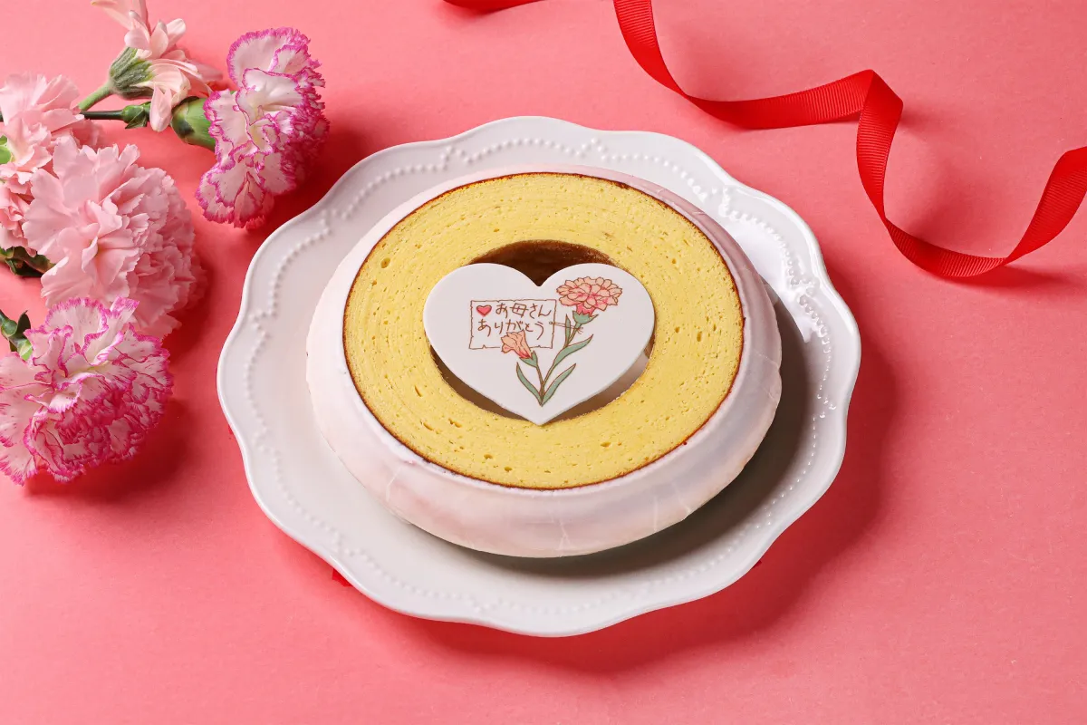 バウムクーヘン中央には、お母さんへの感謝のメッセージが添えられたマジパンプレートがあしらわれ、周囲にはカーネーションの可愛らしいイラストがデザインされています。このビジュアルは、母の日の温かい思いをそのまま伝えるために考えられています。