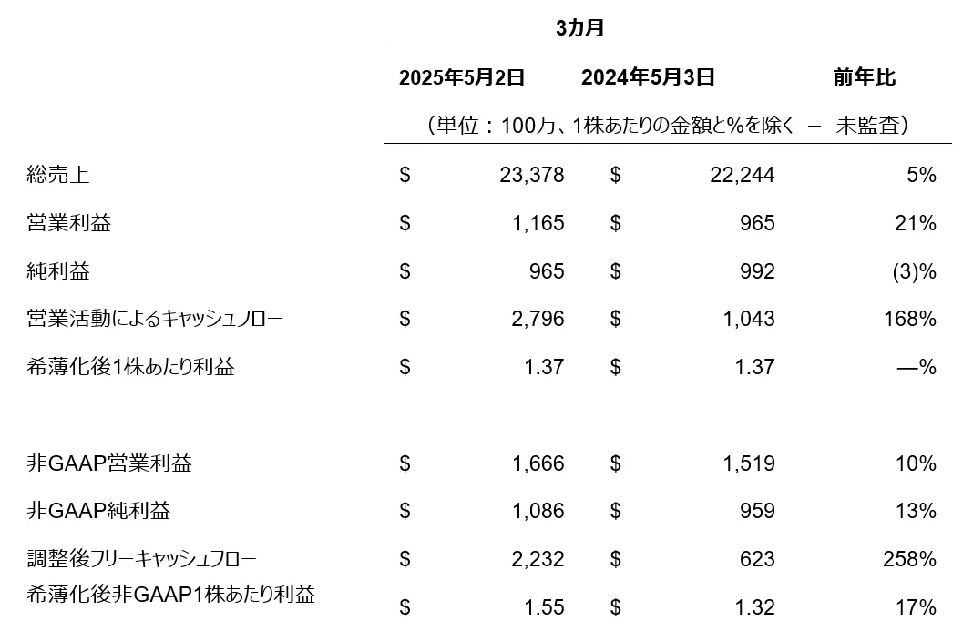 デル・テクノロジーズの売上高は234億ドルで、前年同期比5%増加しました。営業利益は12億ドルと前年同期比21%の大幅増を達成、非GAAPベースでは17億ドルで10%の増加を見せました。希薄化後の1株あたり利益は前年同期比で横ばいの1.37ドルですが、非GAAPベースでは1.55ドルと17%の増加を示しました。