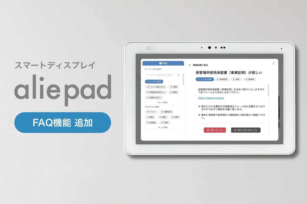 賃貸住宅における問い合わせの負担を軽減するため、株式会社アクセルラボが手掛ける賃貸住宅向けスマートホームサービス『SpaceCorePro』に新機能が追加されました。この新機能「FAQ機能」は、入居者が自ら問題を解決する手助けをすることを目的としています。具体的には、居室に設置されたスマートディスプレイ『aliepad』に『よくある質問』を表示することで、入居者が直接情報を得られる環境を整えました。
