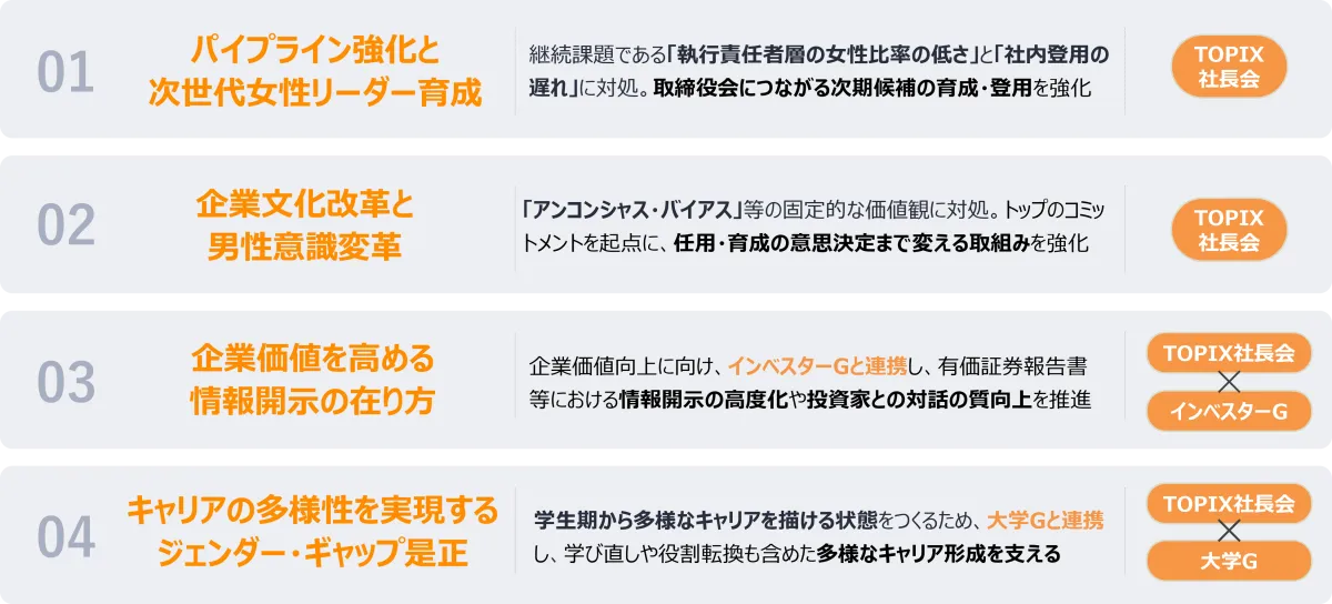 また、インベスター・グループや大学グループとの協力も見込まれており、これらの組織との連携によって企業内における女性活躍の推進を加速させるための新たな目標設定が求められています。