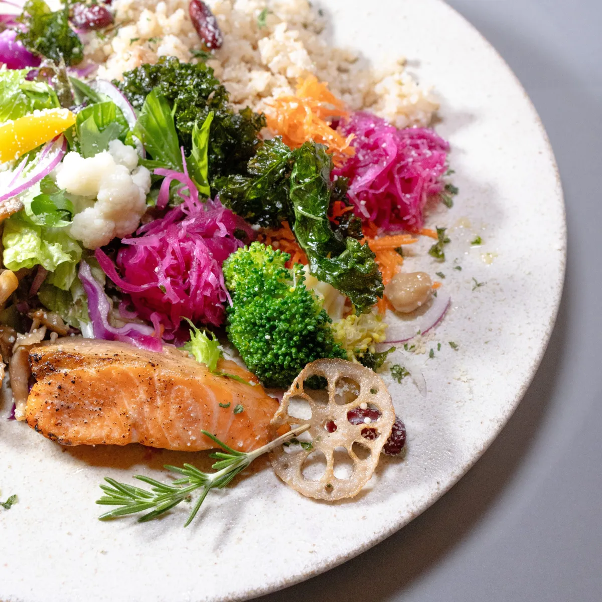 FLUX CAFEは愛媛県の「オイシイオト」とのコラボカフェとして新たに生まれ変わりました。栄養バランスを重視した「一汁三菜」の定食メニューが揃い、特に人気なのが「グリルサーモンサラダプレート」(1,500円)。その他、やわらかい「豚の角煮定食」や健康志向の「鶏むね肉の豆腐ハンバーグ定食」も支持されています。