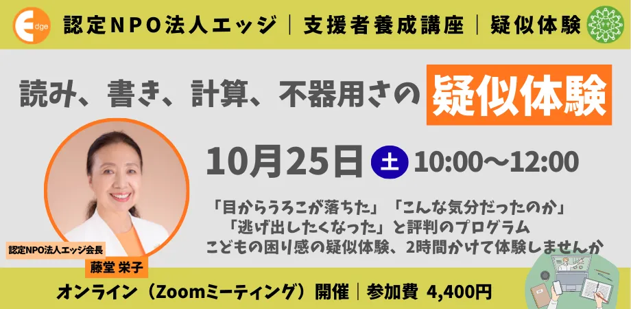 2025年のディスレクシア月間では、全国各地で様々な啓発活動が行われており、認定NPO法人エッジもその一環として特設イベントを実施します。具体的には、10月25日・26日の2日間にわたり、疑似体験やオンライン相談、音声テスト体験を行います。参加することで、ディスレクシアの特性をより深く理解し、自身の教育現場での実践に活かせるかもしれません。