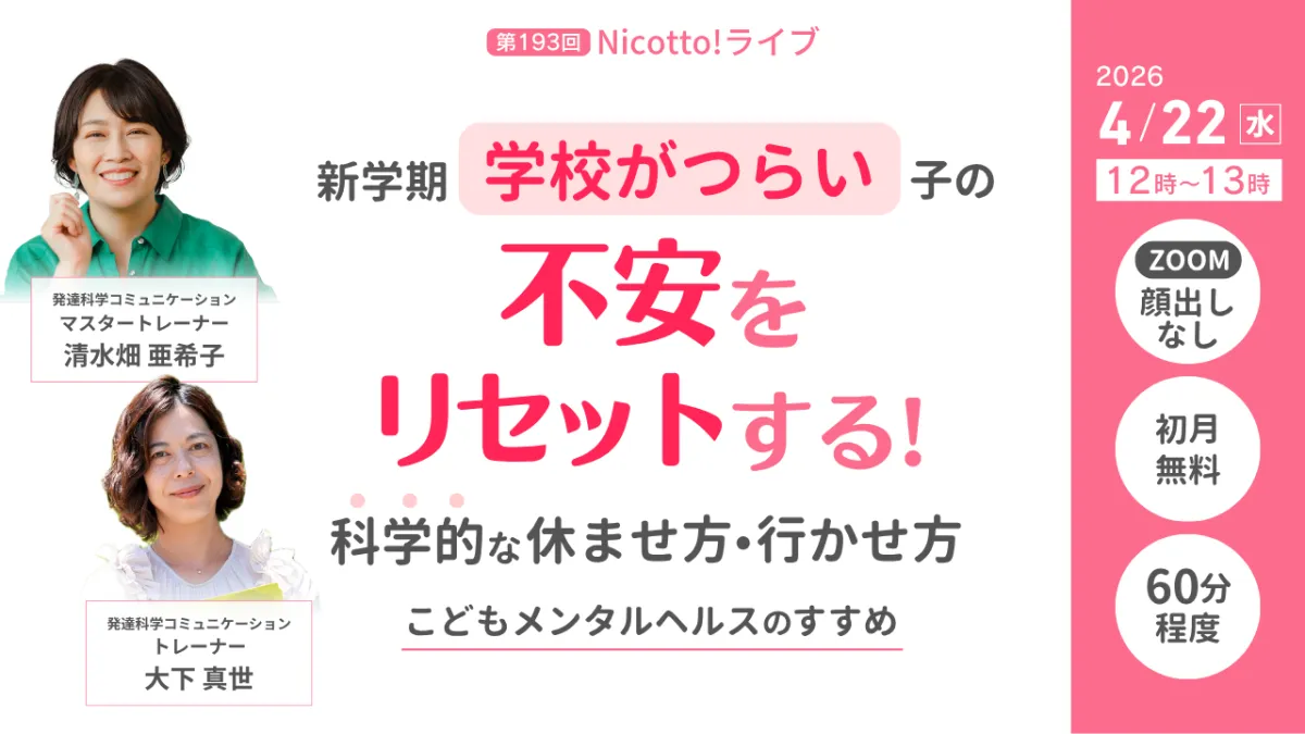 そこで、株式会社パステルコミュニケーションが提供する「Nicotto!塾」は、2026年4月22日(水)12時より、「新学期 学校がつらい子の不安をリセットする!科学的な休ませ方・行かせ方」と題したオンラインライブを開催します。このイベントには、発達科学コミュニケーションの専門家が登壇し、具体的な休ませ方や、家庭内での相談方法について解説します。