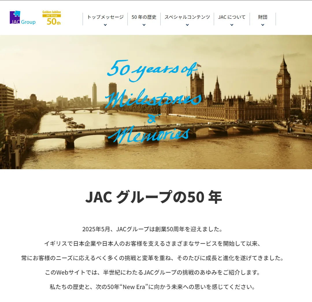 創業50周年を記念して、JACは特設サイト「JAC Group 50周年アニバーサリーサイト」を公開した。このサイトでは、JACの歴史やサービスの展開、今後のビジョンについて詳しく知ることができる。