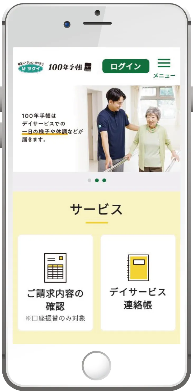 「100年手帳」にログインすると、デイサービスでの健康に関するデータや、請求書、そして当社からのお知らせが閲覧できるようになります。健康データは最大90日前まで遡って確認でき、利用料の請求書は最大15ヶ月分の履歴が見られます。これにより、別居の家族とも情報を簡単に共有できるのです。