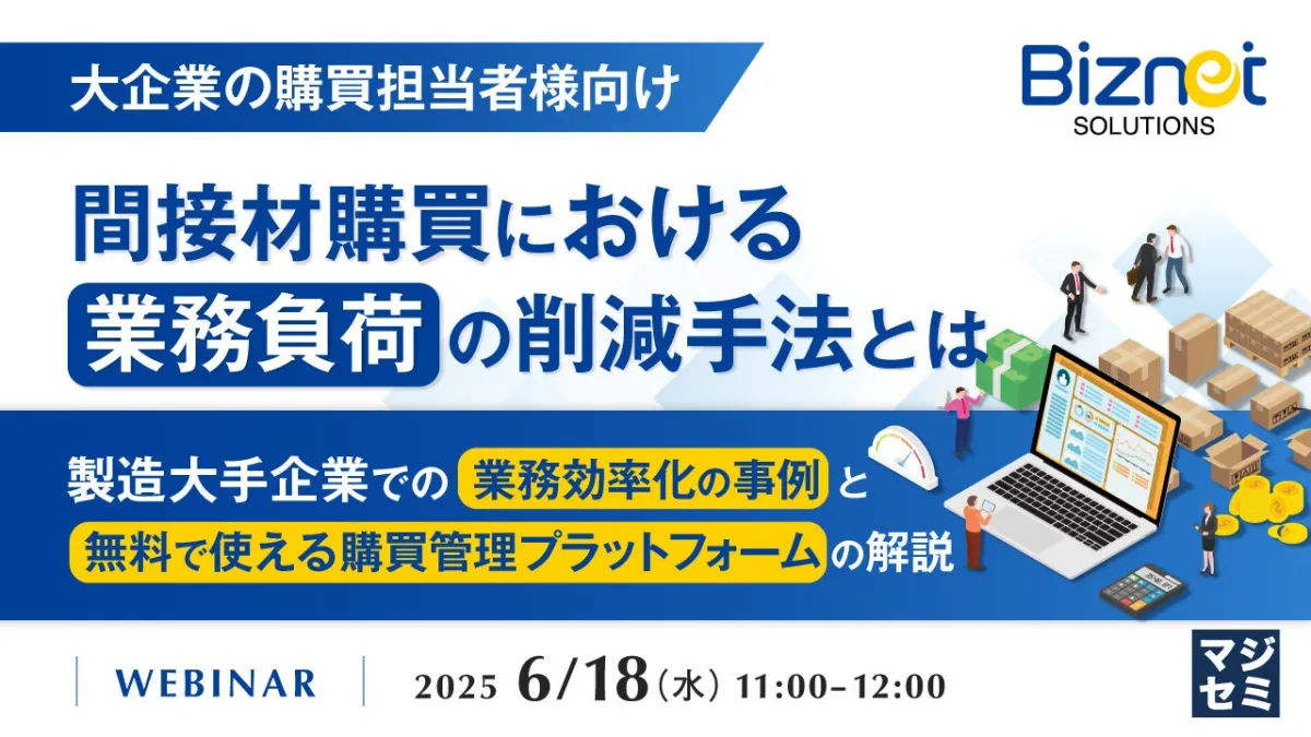 ビズネット株式会社主催のウェビナーが、企業の購買担当者を対象に「間接材購買における業務負荷の削減手法」というテーマで開催されます。このセミナーでは、現状の間接材購買業務で直面している課題を克服し、業務の効率化を図るための戦略が紹介されます。