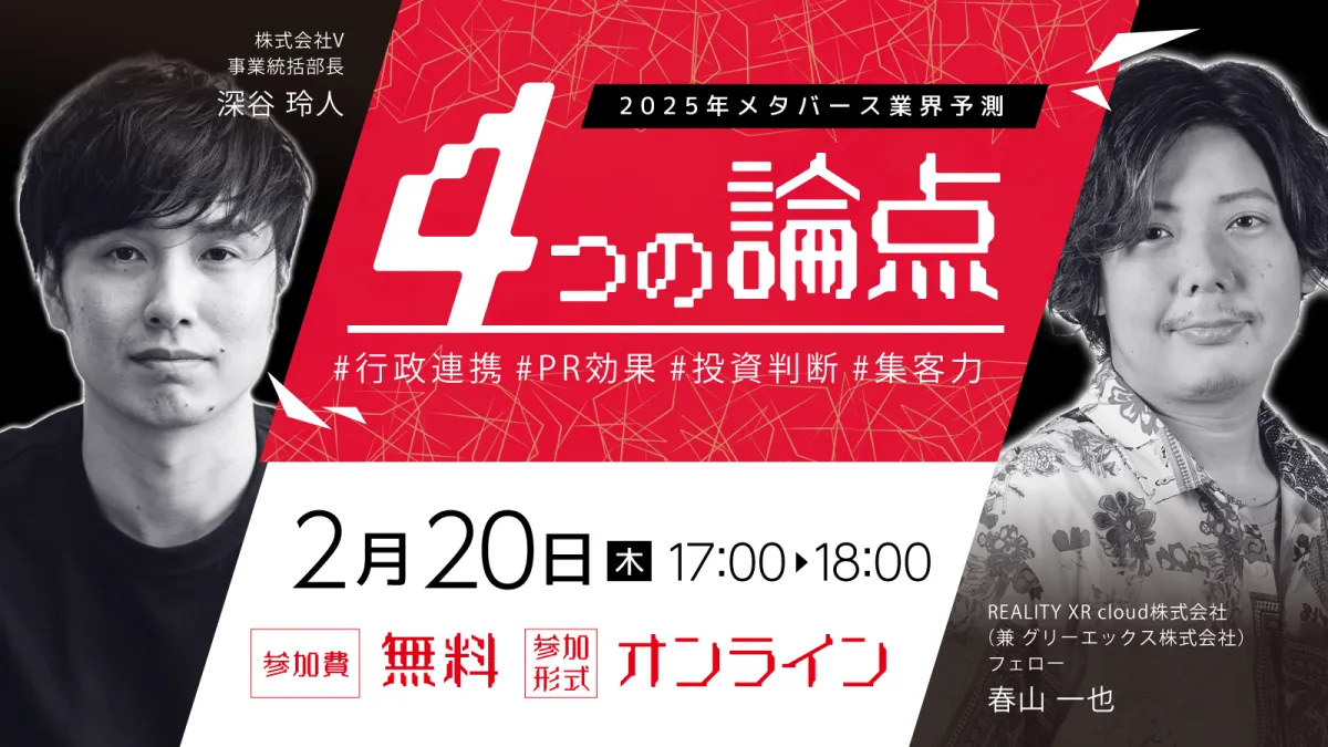 2025年のメタバース業界に迫るオンラインセミナーが、株式会社Vによって開催される。今回のセミナーは「2025年メタバース業界予測:行政連携、PR効果、投資判断、集客力…4つの論点を徹底分析」と題し、メタバースに関する最新の知見を提供することを目的としている。