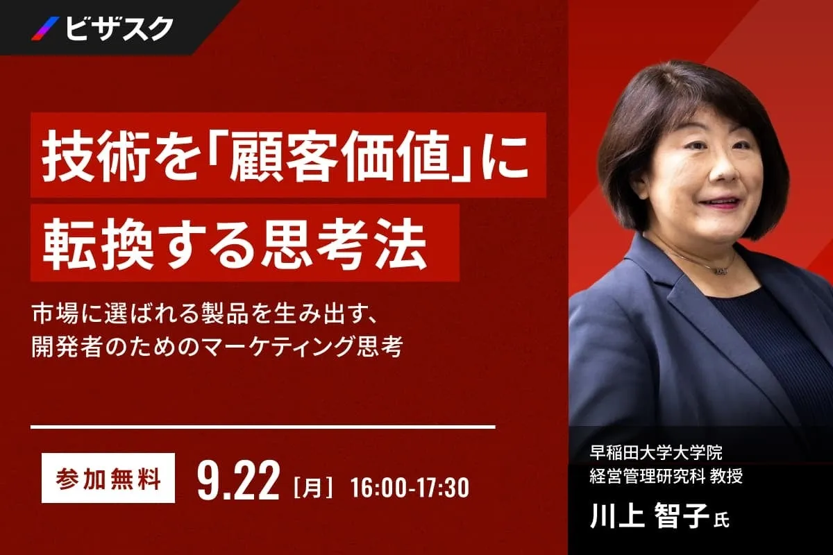 9月22日(月)16:00より、株式会社ビザスクが主催する無料オンラインセミナー「技術を『顧客価値』に転換する思考法」が開催されます。ゲスト講師には、早稲田大学大学院経営管理研究科の教授であり、マーケティング&サステナビリティ国際研究所(MII)の所長である川上智子氏を迎えます。