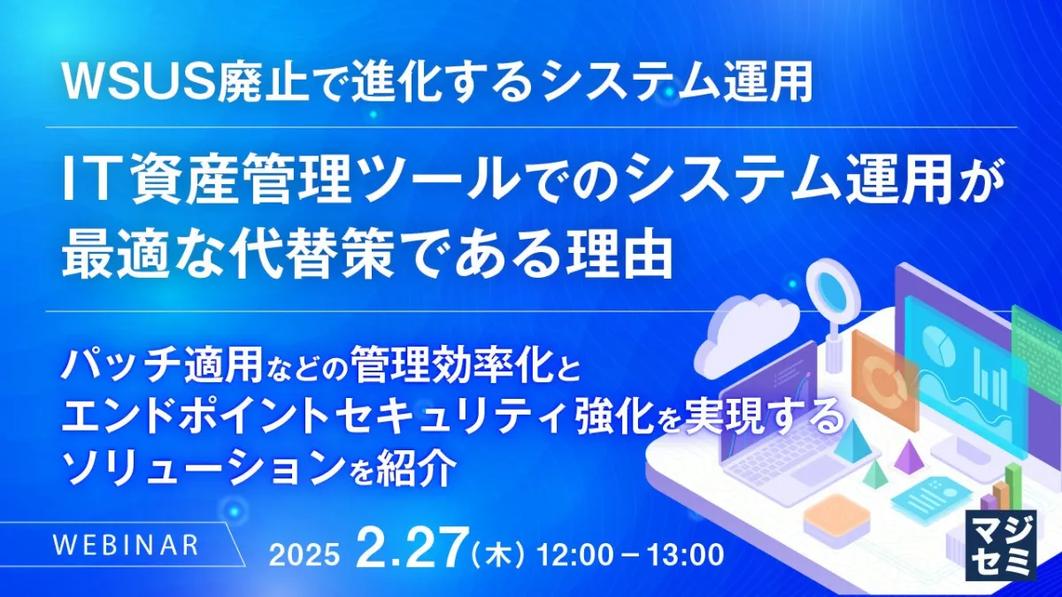本ウェビナーでは、WSUS廃止に伴うシステム運用の見直しを行い、IT資産管理ツールがどのように代替策となるかを詳しく解説します。また、EPPとの組み合わせによるセキュリティリスクの低減についても、具体的なソリューションと導入事例と共に紹介します。特に、参加者が抱える「WSUSの代替ツールは何か」「エンドポイントセキュリティ強化策はどうするか」などの疑問に対して、実用的なアドバイスを提供いたします。