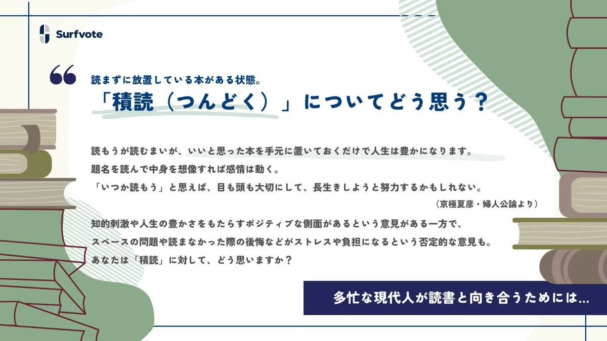 昨今、読書を巡る習慣や価値観が多様化している中、Polimill株式会社が運営するソーシャルプラットフォーム「Surfvote」では、特定のテーマに対する意見を集める活動が行われています。その一環として展開されているイシュー「積読」に対して、どのような意見が寄せられているのか、その内容を掘り下げてみました。