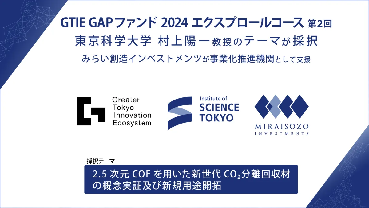 国立大学法人東京科学大学の村上陽一教授が、科学技術振興機構(JST)の『GTIE GAPファンド2024年度 エクスプロールコース(第2回)』において、新たなテーマを提案し採択されました。このテーマは「2.5次元COFを用いた新世代CO₂分離回収材の概念実証及び新規用途開拓」と名付けられています。研究者としての村上教授は、ゼロカーボンエネルギー研究所でフューチャーエネルギー部門の教授職にあります。