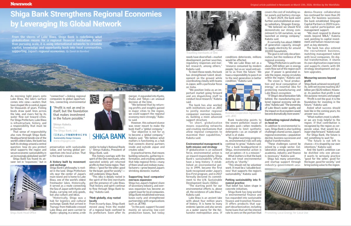 滋賀銀行の頭取、久保田真也氏が米国の著名な週刊誌「Newsweek」の国際版にてインタビューを受けました。この特集は、2026年3月20日号に掲載され、彼の理念や銀行の取り組みが国際的に認識される機会となりました。