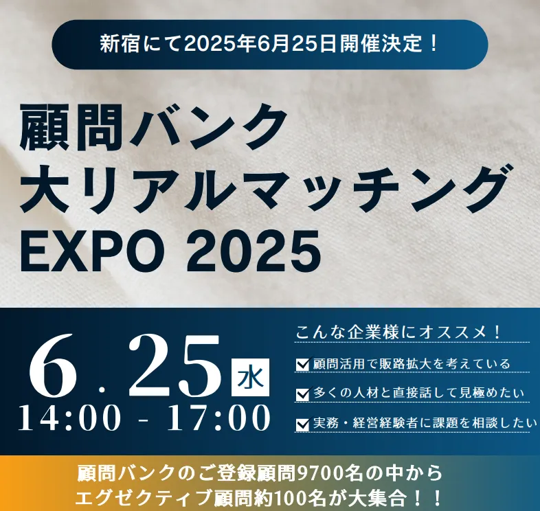 - - 名称:顧問バンク大リアルマッチングEXPO 2025