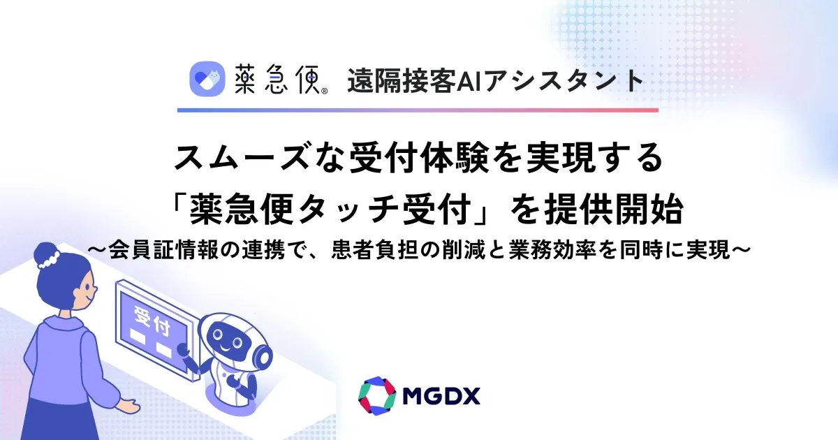 株式会社MG-DXは、新しいサービス「薬急便タッチ受付」を提供開始しました。この機能は、薬局における受付体験を向上させることを目的としています。患者が薬急便会員証をタッチするだけで、無人受付端末が必要となる情報を自動的に取得し、スムーズな受付を実現するという仕組みです。これにより、従来必要だった個人情報の入力が不要になり、待ち時間の短縮と業務の効率化を両立させることができます。