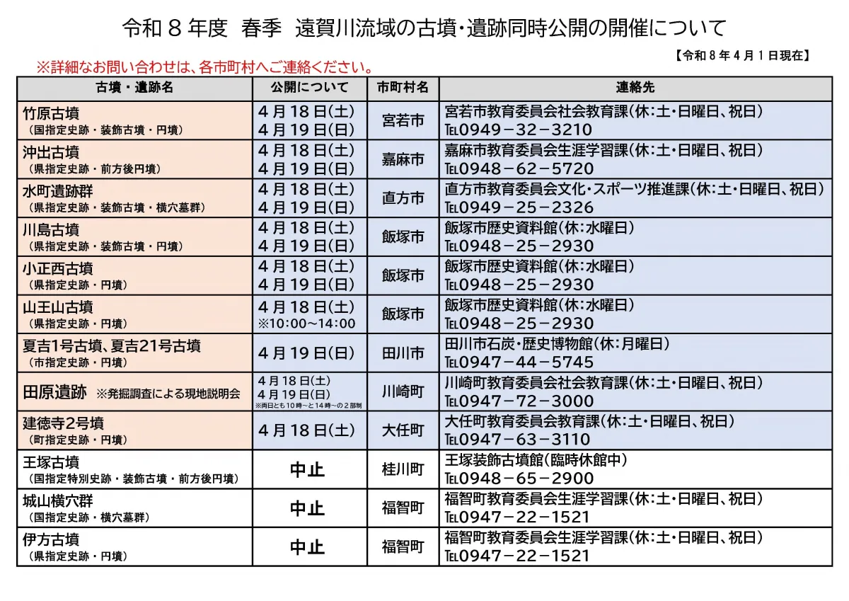 直方市において、地域の歴史資源を活用した特別な歴史体験イベントが行われます。その名も「古墳一斉公開イベント」。本イベントでは、遠賀川流域に位置する5市3町が協力し、地元に残る貴重な古墳や横穴墓を一緒に公開します。こうした歴史的資源を通じて、来訪者が地域の文化に触れる機会が提供されるのです。