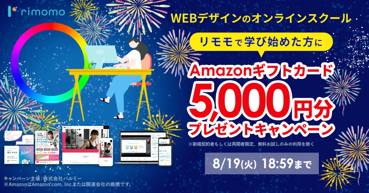 2025年8月7日から19日までの期間限定で、株式会社パルミーが運営するオンライン学習サービス「rimomo(リモモ)」に新規契約した方に、Amazonギフトカード5,000円分をプレゼントするキャンペーンが実施されます。さまざまなデザインスキルを学べるrimomoは、この機会にぜひ活用したいサービスです。