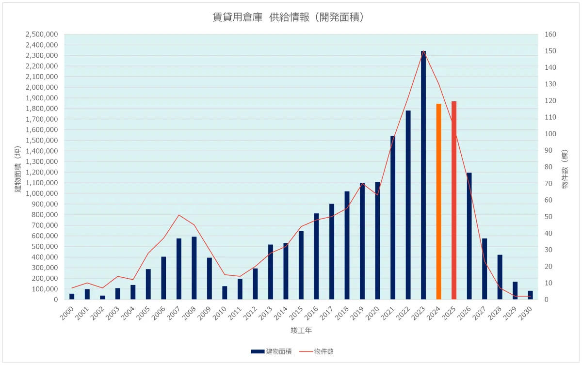 レポートでは、日本全国の賃貸用物流倉庫の供給推移を示したグラフも掲載されます。2000年以降、最大供給量となったのは2023年の約234万坪で、2024年はやや減少し約184万坪になりました。しかし、2025年には再び供給量が増加し、過去2番目の約187万坪になると予測されています。これにより、物流倉庫市場の回復が見込まれます。