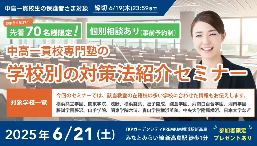 このセミナーでは、横浜地域の中高一貫校に通う生徒たちが直面する課題や、定期テストに向けた効果的な対策法を紹介します。対象となる学校には、横浜共立学園や関東学院、浅野など、地域の名門校が含まれています。