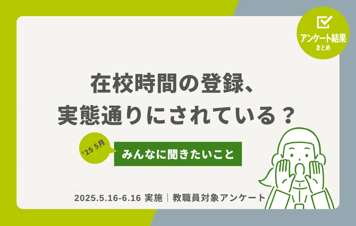 今回の法改正の鍵となるのが、各学校および自治体で行われている在校時間の正確な把握です。しかし、実際の状況はどうなっているのでしょうか。実態を把握するため、全国の教職員に対してアンケートを実施しました。これは、全国の教員が「超過勤務を指摘されないために実態と異なる在校時間を登録しているのではないか」との懸念から始まりました。