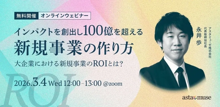 アスタミューゼ株式会社は、2026年3月4日(水)12:00から13:00に、新規事業担当者や経営企画担当者に向けた無料ウェビナー「インパクトを創出し100億を超える新規事業の作り方 ~大企業における新規事業のROIとは?~」を開催します。参加登録は以下リンクから可能です。