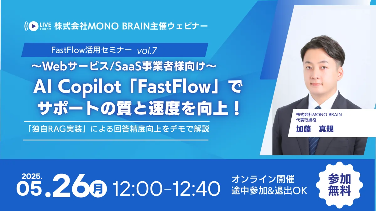 カスタマーサポートの向上を目指すウェビナーが、2025年5月26日(月)に開催される。この無料オンラインイベントは、株式会社MONO BRAINが主催するもので、WebサービスやSaaS事業者を対象に、最新機能であるRAG(Retrieval-Augmented Generation)の実装について詳しい解説が行われる。